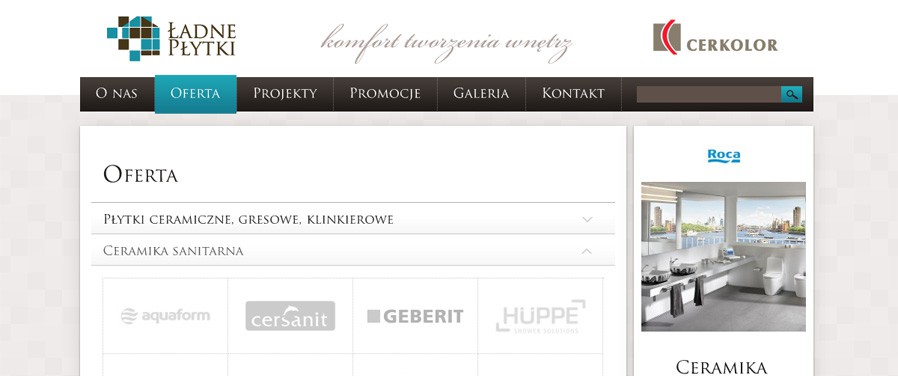 Firma prezentuje swoje produkty poprzez lokację w określonych aranżacjach. Realizując tą strategię, wyposażyliśmy stronę firmową w dedykowany katalog produktów prezentujący aranżacje i pełne palety kolekcji. Mając na uwadze ciągle zmieniającą się ofertę i samodzielną obsługę strony przez pracowników Cerkolor stworzyliśmy jak najbardziej przyjazny panel administracyjny. Jako trzon programistyczny serwisu posłużył system CMS Drupal 7, dający duże możliwości rozwoju o dodatkowe funkcjonalności. Uzupełnieniem serwisu głównego jest moduł dystrybucji, pozwalający na łatwą lokalizację pobliskiego punktu sprzedaży.